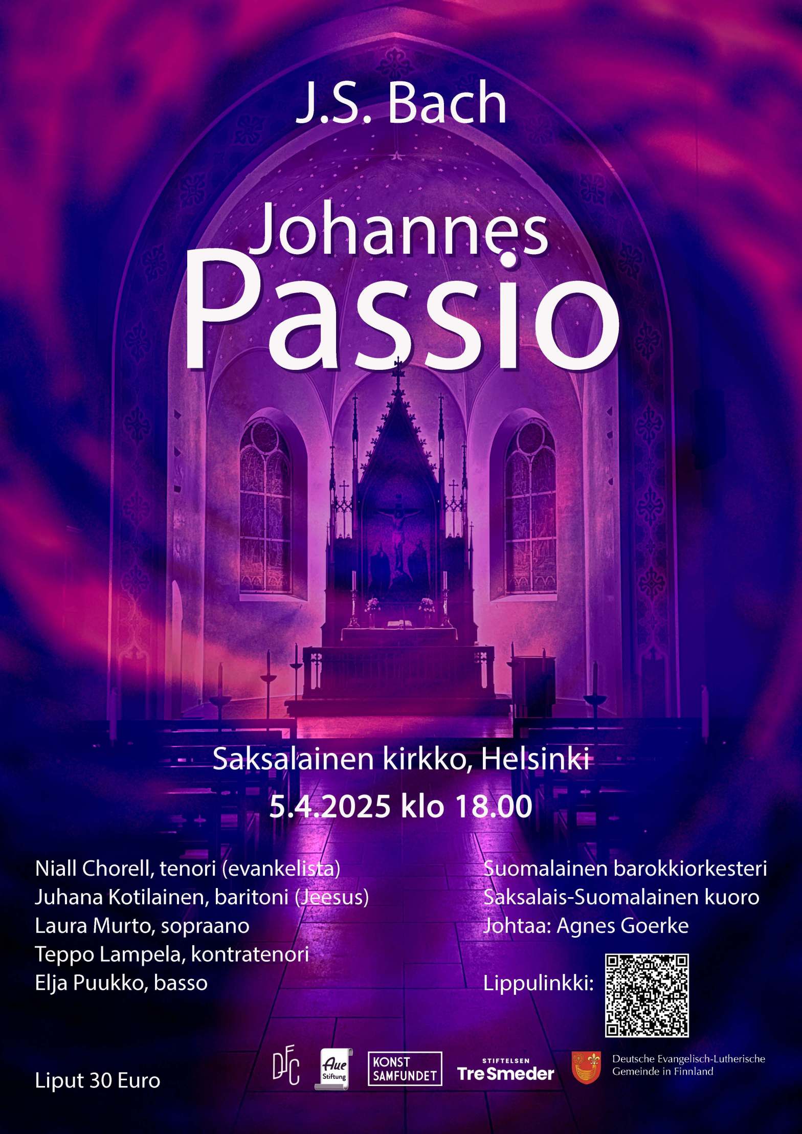 Lauantaina 5.4.2025 klo 18.00 Saksalais-suomalainen kuoro esittää Johann Sebastian Bachin Johannes-passion solistien ja Suomalaisen barokkiorkesterin kanssa.