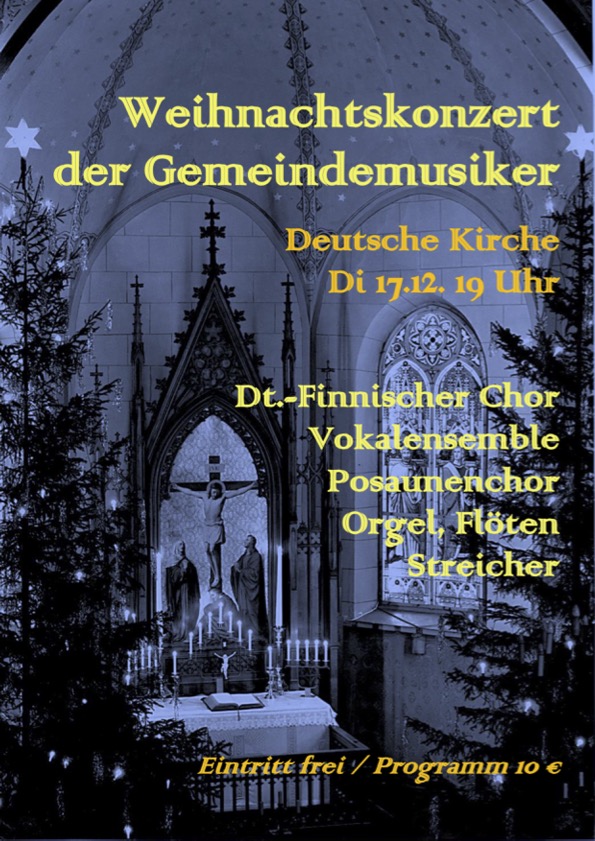 Der Deutsch-Finnische Chor singt traditionelle wunderschöne Weihnachtschorsätze und -motetten bei diesen musikalischen Veranstaltungen: Dienstag 12. Dezember 19.00 Uhr Deutsche Kirche, Helsinki: Weihnachtskonzert der Gemeindemusiker. Mit dabei sind auch das Vokalensemble, Sologesang, instrumentale Kammermusik und der Posaunenchor: Programm 10 Euro Samstag 16. Dezember 14.00 Uhr Turku Dom: Singen der schönsten deutschen Weihnachtslieder. Mit dabei sind auch„Weihnachtskonzerte“ weiterlesen
