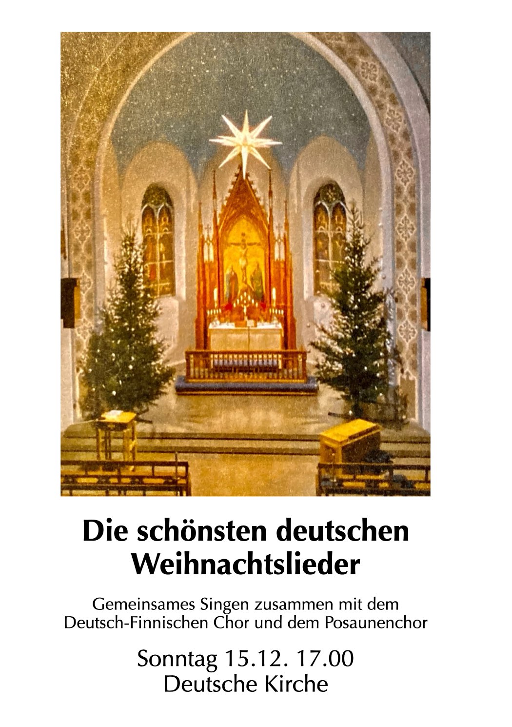 Am Sonntag, dem 15.12.2024 in der Deutschen Kirche (Unioninkatu 1) um 17.00 Uhr: gemeinsames Singen der schönsten deutschen und deutschsprachigen Weihnachtslieder (Eintritt frei). Wer das finnische Konzept der „schönsten Weihnachtslieder“ (finnisch: „kauneimmat joululaulut“) noch nicht kennt: man trifft sich in der Vorweihnachtszeit in verschiedenen Kirchen in ganz Finnland und singt zusammen Weihnachtslieder. Es darf also sehr gerne mitgesungen werden!„Die Schönsten deutschen Weihnachtslieder“ weiterlesen