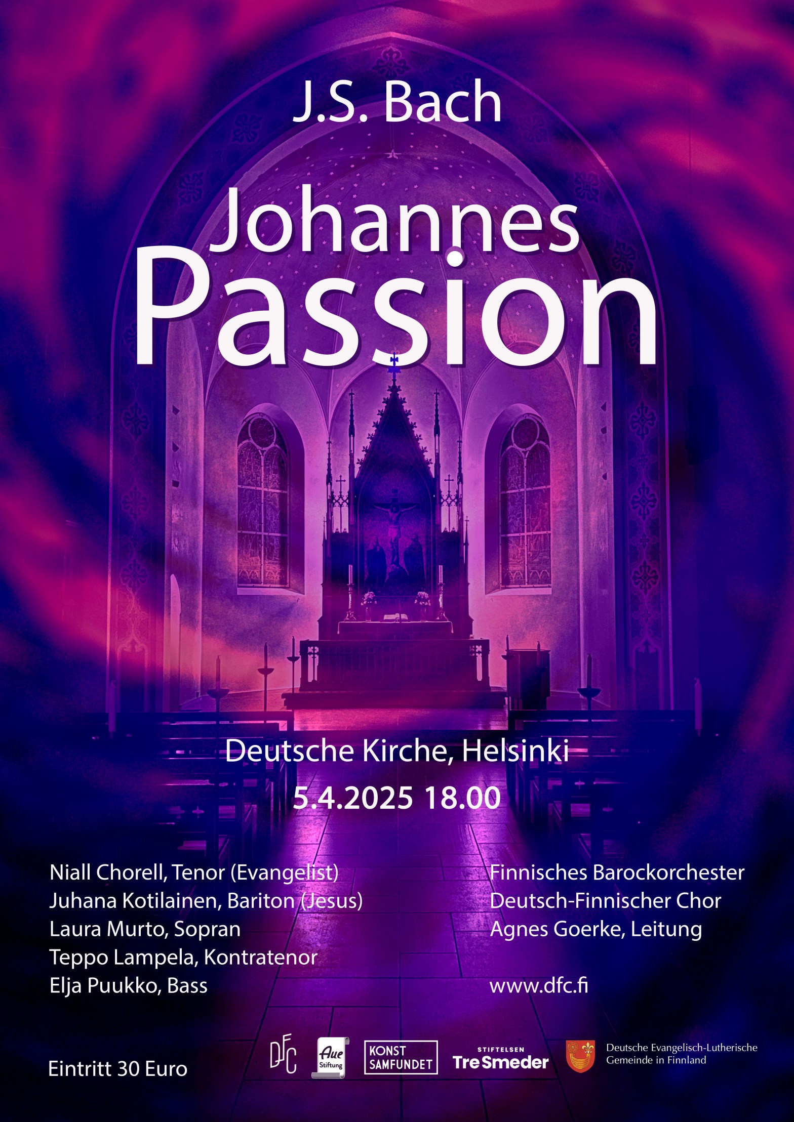 Am Samstag, dem 5. April 2025 um 18.00 Uhr wird der Deutsch-Finnische Chor mit Solisten und dem Finnischen Barockorchester Johann Sebastian Bachs Johannes-Passion aufführen.
