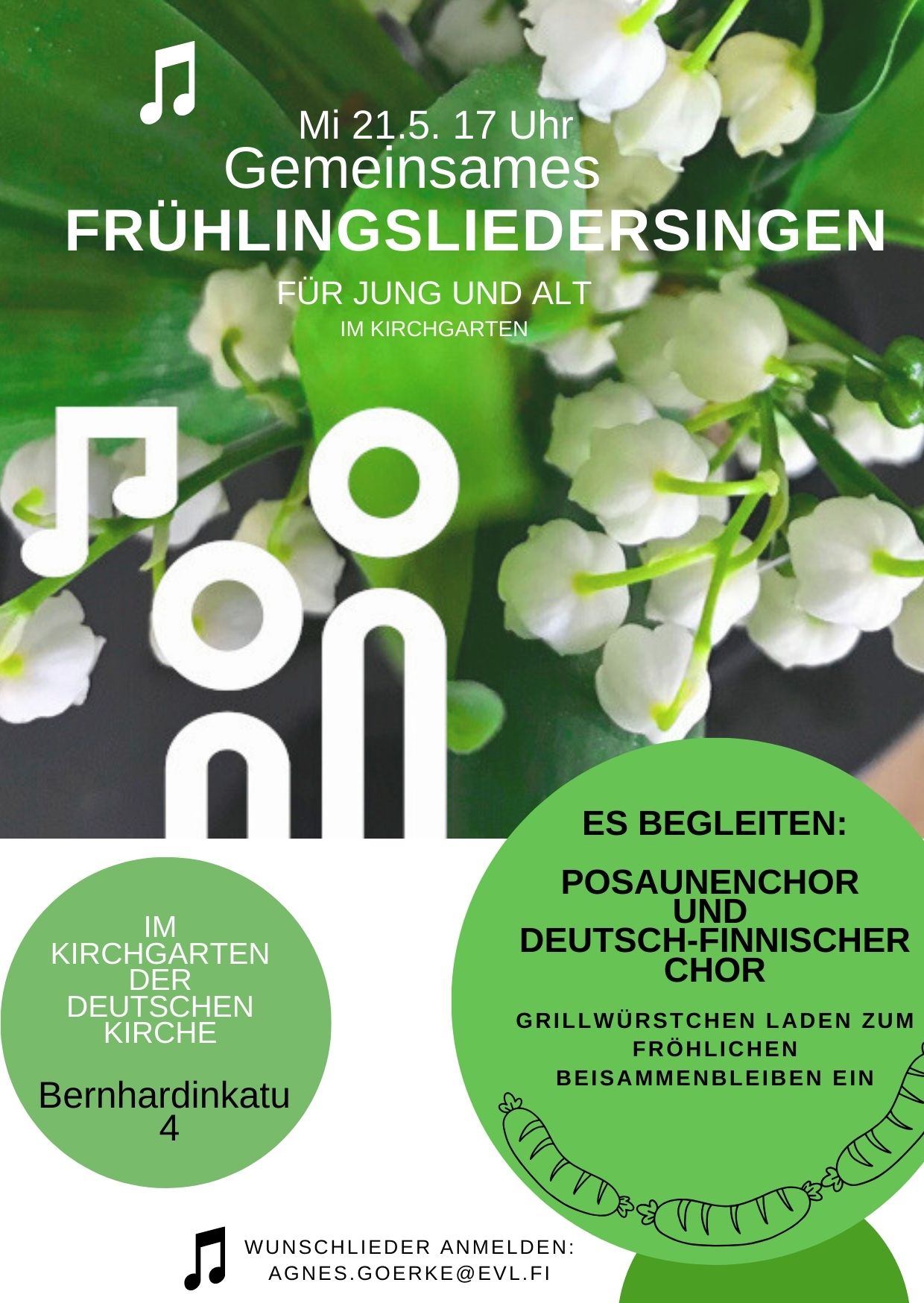 Herzliche Einladung zum gemeinsamen offenen Singen beliebter deutscher Frühlings– und Volkslieder am Mittwoch, dem 21. Mai um 17 Uhr im Garten der Deutschen Kirche in Helsinki! Posaunenchor, Deutsch–Finnischer Chor und Agnes Goerke am Klavier begleiten die Lieder, und Pastorin Päivi Lukkari wird uns sicher wieder Anekdoten und Hintergründe zu manchem Lied erzählen. Wunschlieder kann man„Gemeinsamen Singen beliebter deutscher Frühlings– und Volkslieder“ weiterlesen
